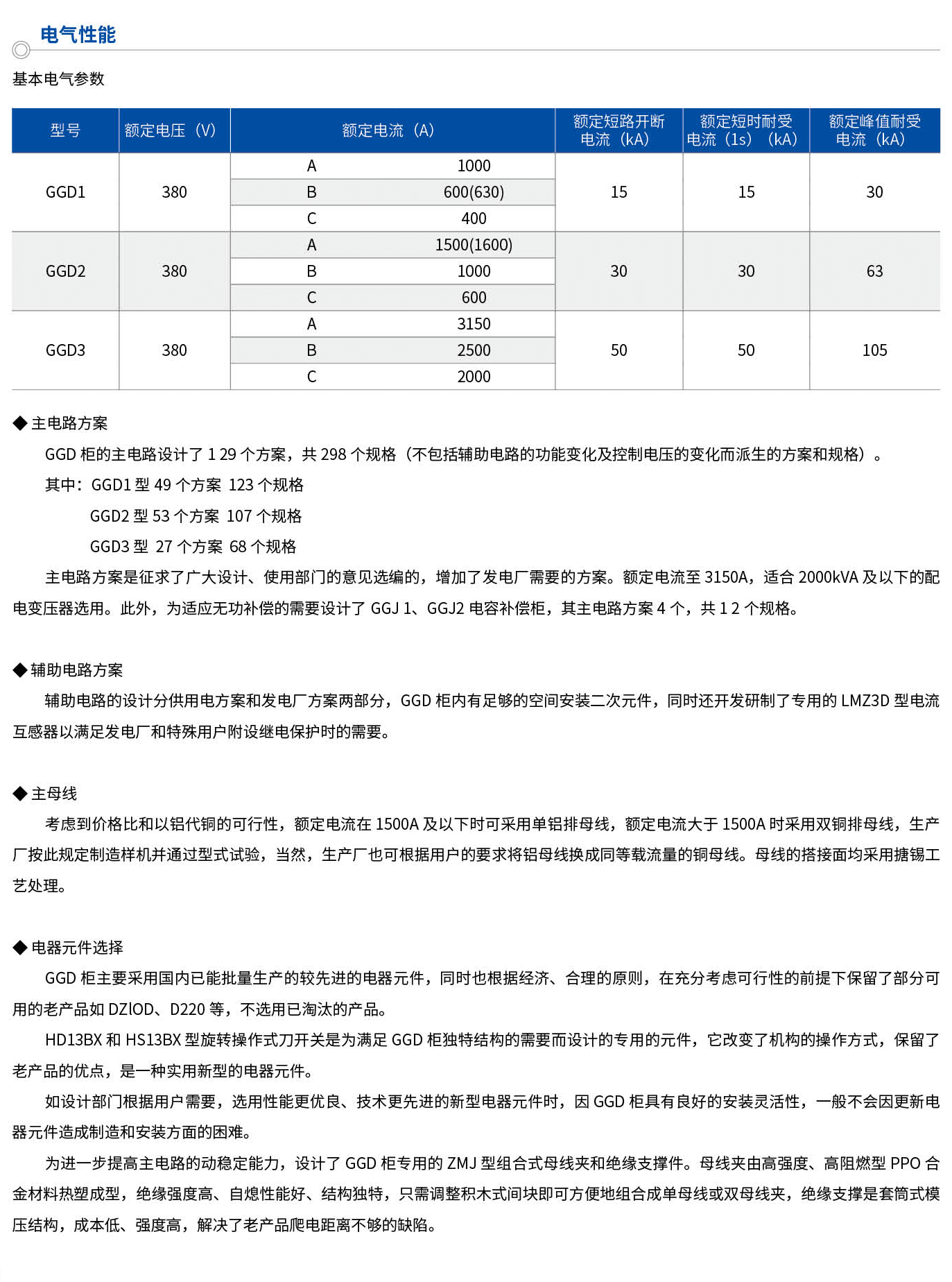 GGD交流低压固定式开关柜适用于发电厂、变电站、厂矿企业等电力用户的交流50HZ,额定工作电压380V,额定工作电流至3150A的配电系统,作为动力、照明及配电设备的电能转换、分配与控制之用。GGD交流低压固定式开关柜是根据能源部主管上级与广大电力用户及设计部门的要求,本着安全、经济、合理、可靠的原则设计的新型低压配电柜。产品具有分断能力高、动热稳定性好、电气方案灵活、组合方便、系列性、实用性强、结构新颖、防护等级高等特点,可作为低压成套开关设备的更新换代产品使用。GGD交流低压固定式开关柜符合EC439《低压成套开关设备和控制设备》,GB7251《低压成套开关设备》等标准。